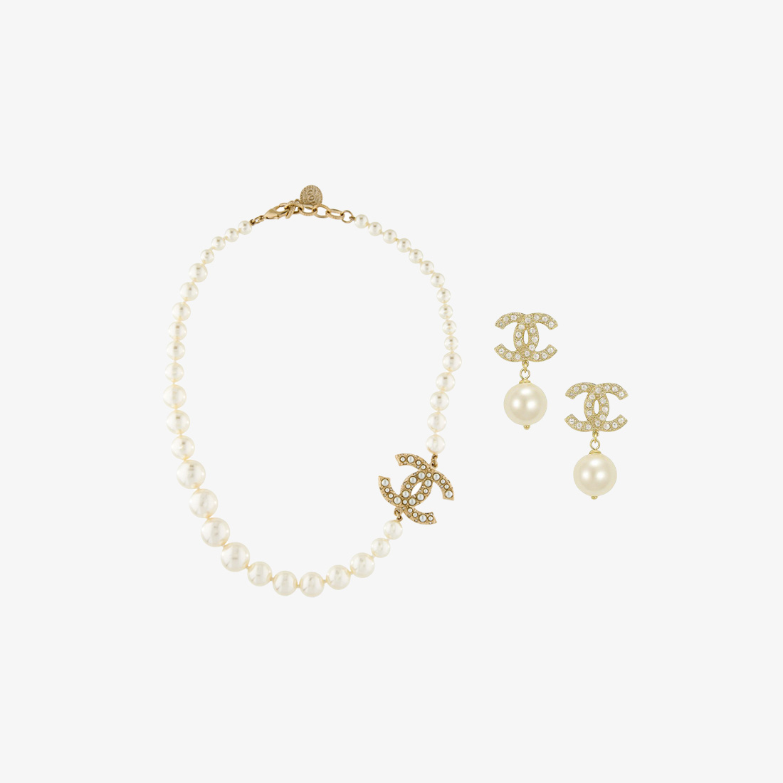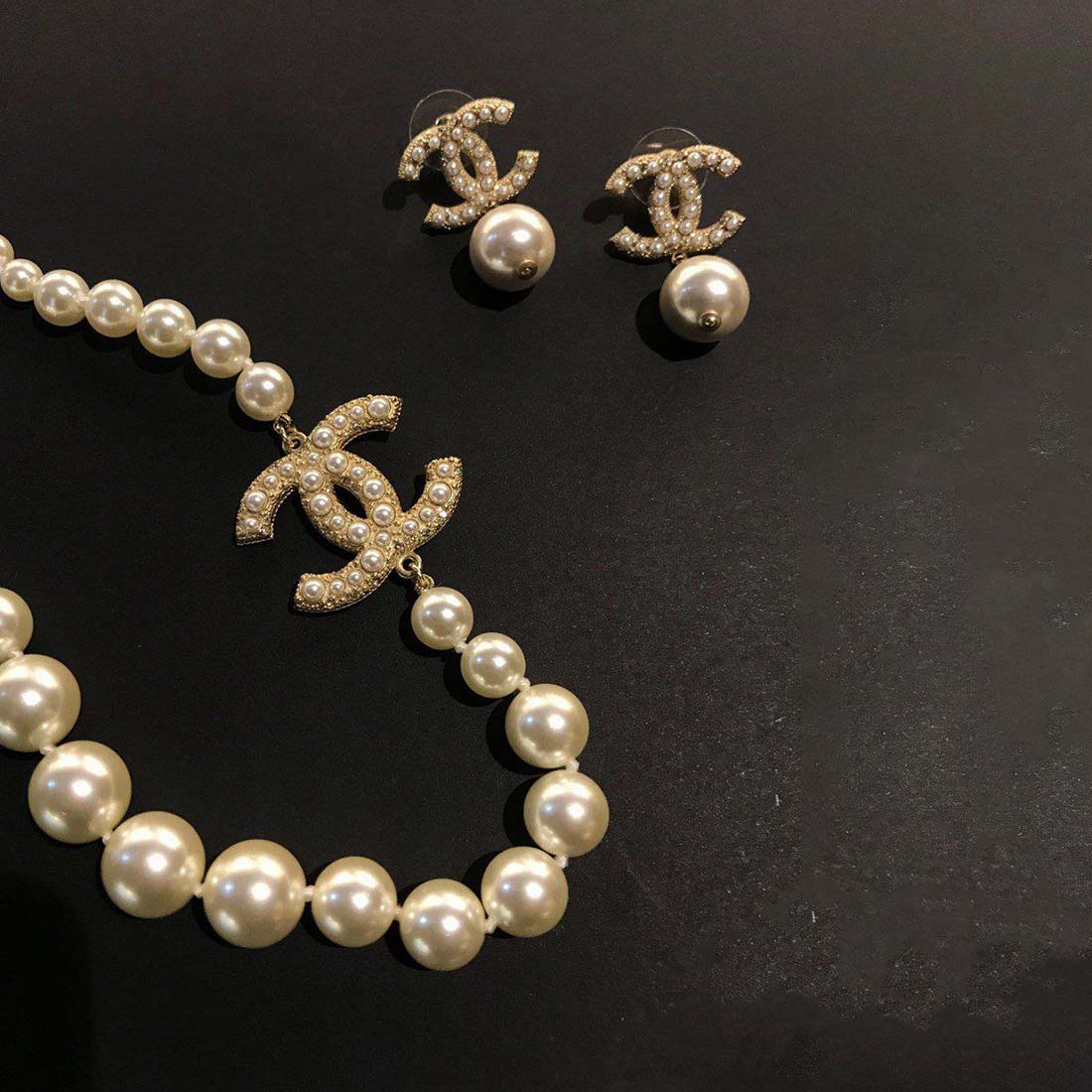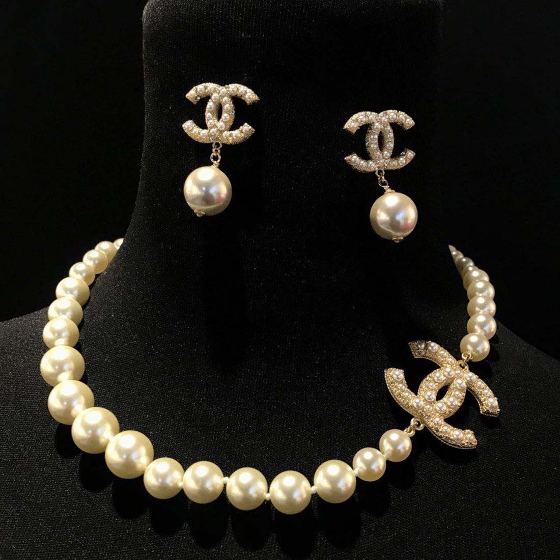 Chanel CC Logo Classic Pearl Choker Necklace & Earrings Set – Super Master Quality
