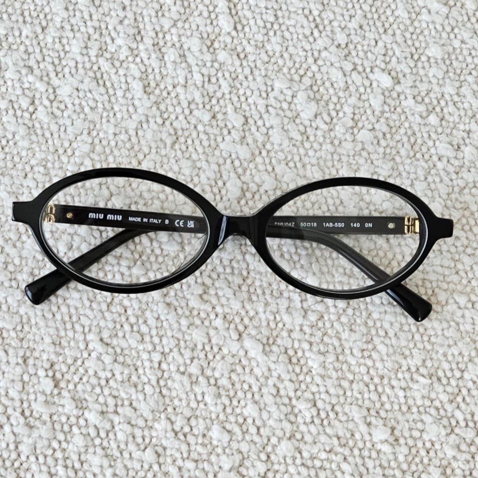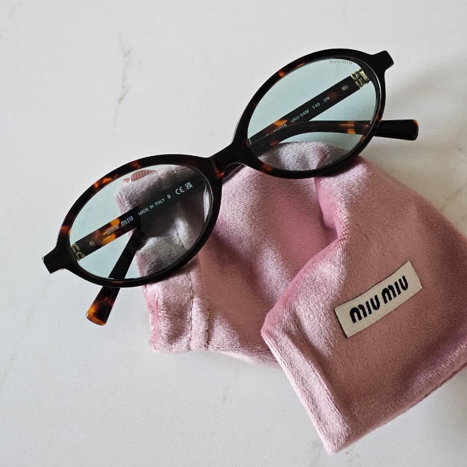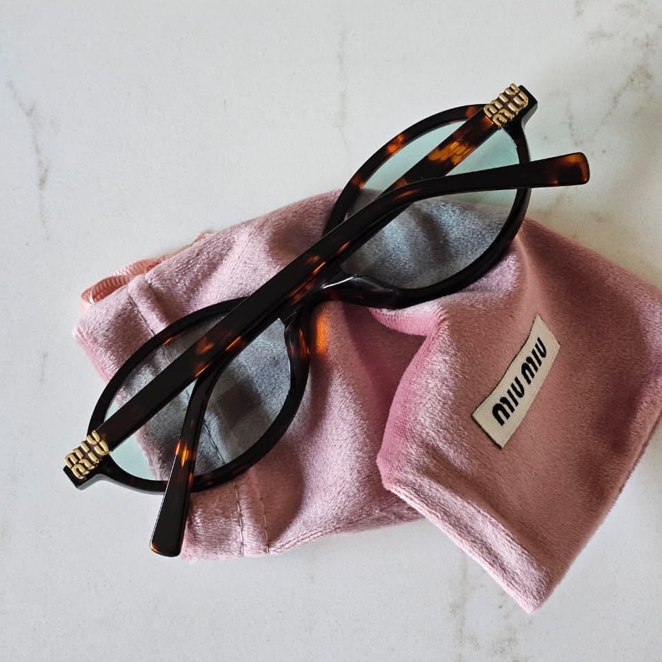 The subtle gold Miu Miu logo detailing on the temples adds a refined designer touch without overpowering the minimalist aesthetic. Its smooth sculpted structure, precise hinge alignment, and polished finish reflect elevated craftsmanship and attention to detail.