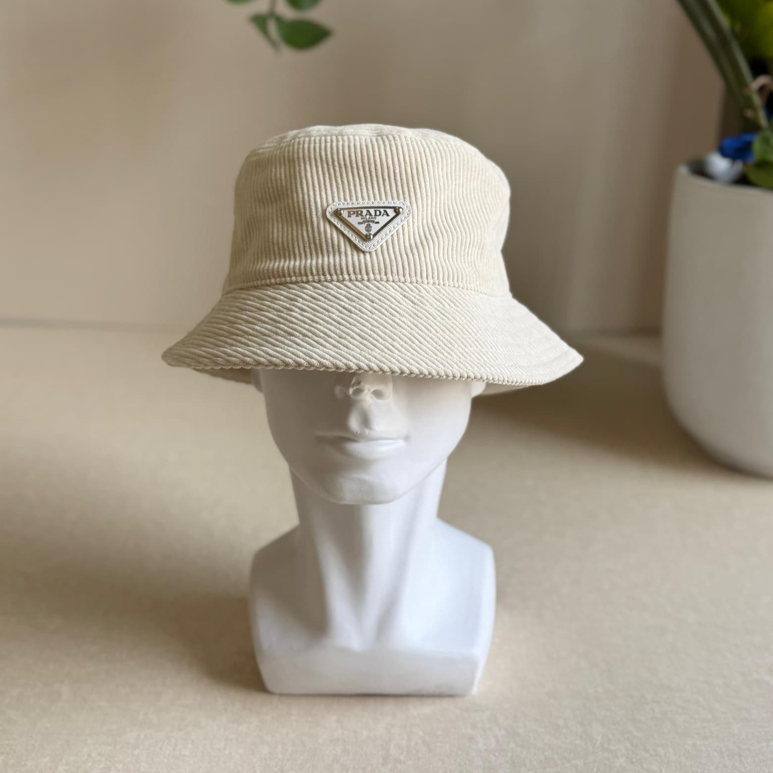A premium Prada corduroy bucket hat featuring the iconic triangle logo and a timeless, versatile silhouette.